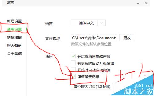 2、在【通用设置】选项卡中,将【保留聊天记录】复选框打钩即可。