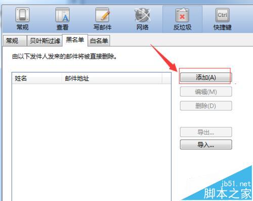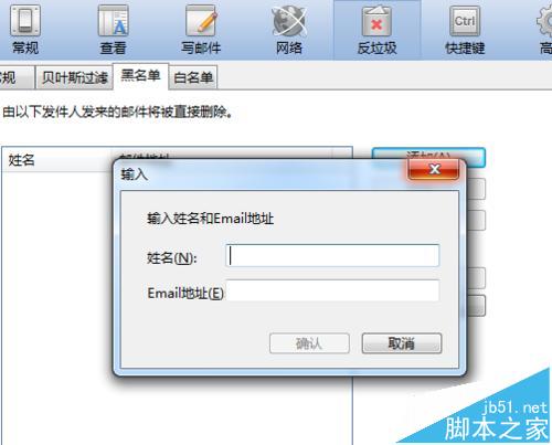 6、就可以在中输入邮件姓名和邮件的地址,然后点击“确定”的按钮之后,黑名单就添加到列表中,就这样在黑名单的邮件就会被拦截了。