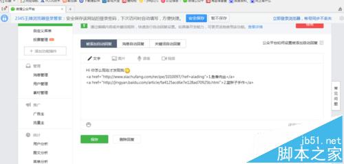 3、在自动回复里输入代码 <a href="链接地址">名称</a>,然后下拉保存,如图所示