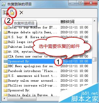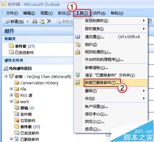 7、退出注册表,重新打开 Outlook。再次打开“文件夹->恢复已删除项”时,按“shift+Deletedit”删除的邮件会被列出,选中恢复即可。