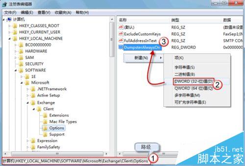 5、请按如下路径展开注册表项:HKEY_LOCAL_MACHINE\SOFTWARE\Microsoft\Exchange\Client\Options,在 Optinos 右侧细节窗口空白处,右击鼠标,选择“新建-DWORD值”。并将新建值命名为DumpsterAlwaysOn。
