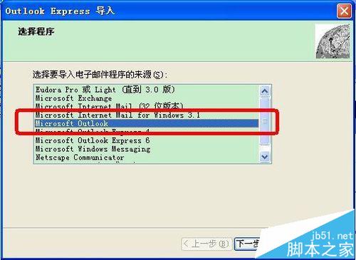 2、在“Outlook Express”中,点击功能菜单条中的“文件”->“导入”->“邮件”,弹出邮件导入向导页面,选择“Microsoft Outlook”,点击“下一步”。