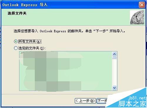 3、点击“所有文件夹”,点击“下一步”,系统开始把Outlook 2003的邮件文件夹导入到Outlook Express(这些文件被保存成.dbx格式)。