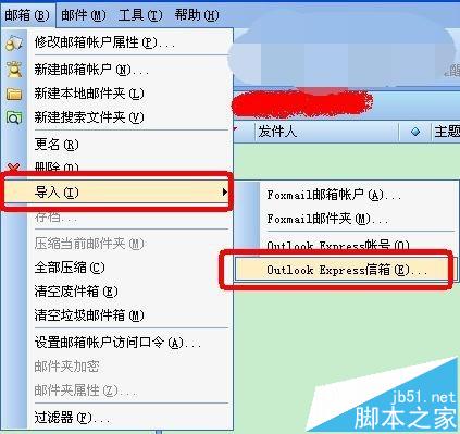 4、打开“Foxmail”,选择“邮件”->“导入”->“Outlook Express信箱”。