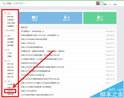 2、进入自己的公众号首页后,在“设置”选项中找到并点击“安全中心”;