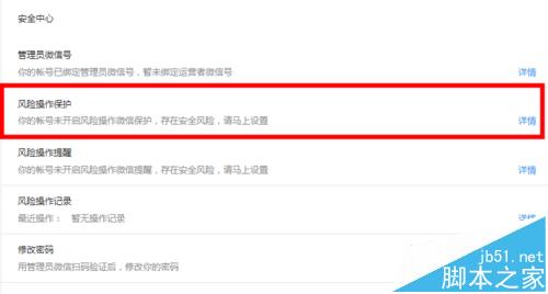 3、点击后,进入“安全中心”,选择“风险操作保护”一项,在该项后面有蓝色字样的“详情”,点击“详情”;