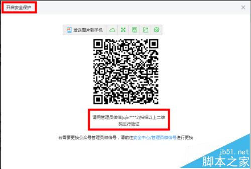 5、弹出“开启安全保护”,提示“请用管理员微信。。。扫描上二维码进行验证”;