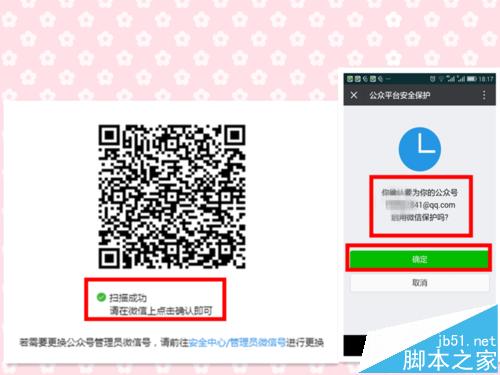 6、手机打开微信,扫描二维码,扫描后,电脑上显示扫描成功,手机上弹出“你确认要为你的公众号xx启用微信保护吗?”,点击“确定”;