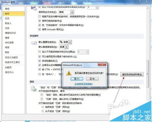 2、在【Outlook 选项】窗口切换到【邮件】标签,右侧窗口找到【发送邮件】一栏,去掉【在"收件人"、"抄送"或"密件抄送"行键入时使用自动完成列表建议姓名】前面的勾