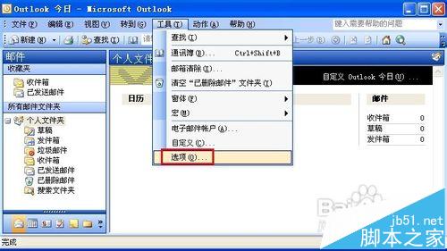 1、打开Outlook,在菜单栏单击【工具】——【选项】