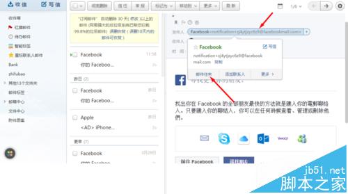 4、选择这个邮件,找到发件人,在弹出的选项卡中选择邮件往来