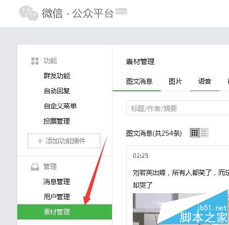 2、点击左侧菜单栏的素材管理,再点击右侧的 新建图文