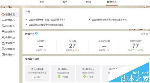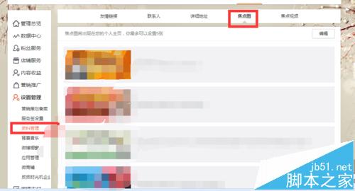 2、认证号的话,你会看见在主页这一排有服务和管理中心,点击下管理中心就会出现图中的界面,大家可以看见左边竖下来的一排有很多工具,粉丝服务营销推广,等等,修改焦点图或者上传焦点图,我们点击下“设置管理”