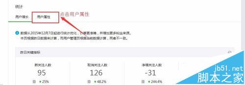 4、进入该页面之后我们可以看到有两个按钮一个是“用户增长”,另一个是“用户属性”,这时候我们应该点击“用户属性”,进入该页面。