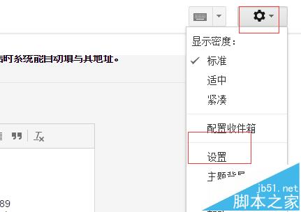 1、我们登录自己的gmail邮箱,然后右侧齿轮状的按钮,在弹出的框中选择“设置”选项。