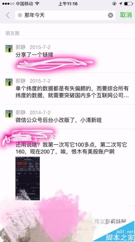 5、在信息流列表里即可看到用户过去同一天发布的内容,下面部分,则是好友发布的内容,一直将信息流往下拖,即可看到大部分好友过去同一天发布的内容。