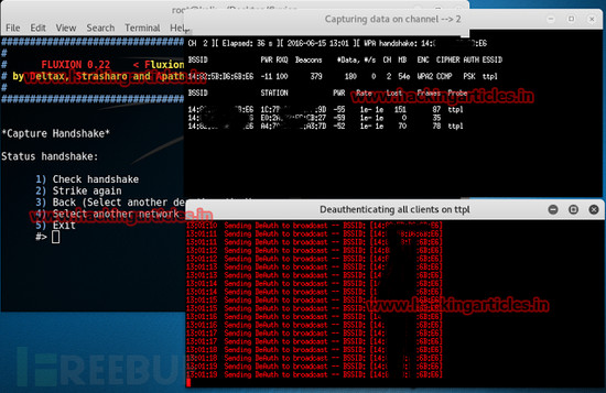 上一个步骤结束之后它会自动打开两个新的终端控制窗口。一个窗口主要是抓取WPA数据包的,而另外一个窗口是分配数据包的。然后我们在原来的窗口上选择1让它继续抓包。