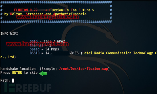 这里会碰到一个选项叫你选择握手包的保存路径。你可以直接空格键跳过,这样握手包会默认保存在/root/Desktop/路径下。随后选择1,其目的是选择aircrack-ng开始抓取握手包。