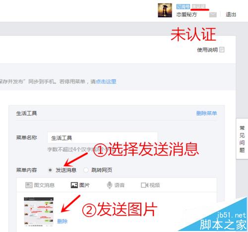 2、以我个人的公众号为例。这是一个没有认证的公众号。菜单栏可以选择发送图片。