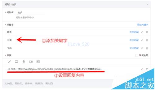 4、然后就是重点,自动回复的设置问题。如图所示,我们只需要把自动回复设置为<a href="网址">显示文字</a>即可。网址输入目标网站,文字设置为要显示的文字。这样用户点击就能进入到目标网站。