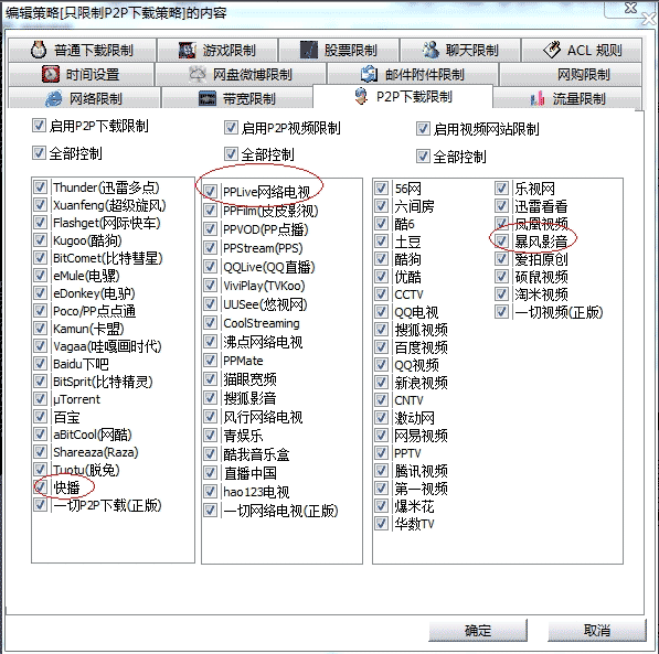 同时,借助于聚生网管你还可以禁止局域网P2P下载、禁止在线看视频等,从而可以防止P2P软件、在线视频播放软件对局域网网速的抢占,如下图所示: