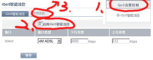 3、分为1、3、4步骤,分别在栏目里找到“iQoS智能流控”功能,然后启用它,最后点击进去宽带限制。