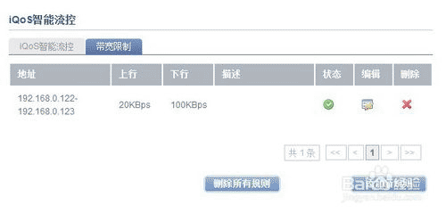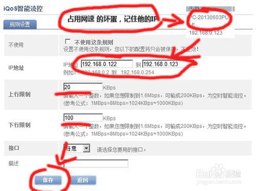 5、我之前我们查到的占用网速过高的IP记录,在IP段输入地址,在限制上传速度那输入限制上行和下行,一般设置上行为20KB,下行为100KB就好了,最后点击保存。