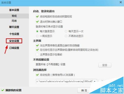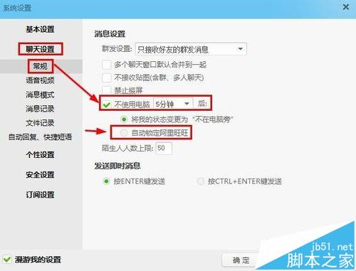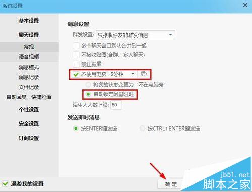 6、当然我们也可以设置指定的时间,不使用的话,自动锁定。我们可以在系统设置的聊天设置中将不使用电脑多长时间后自动锁定阿里旺旺。