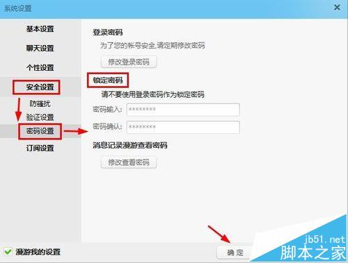 3、安全设置的密码设置中我们右边锁定密码输入自己要设置的密码,点击确定。