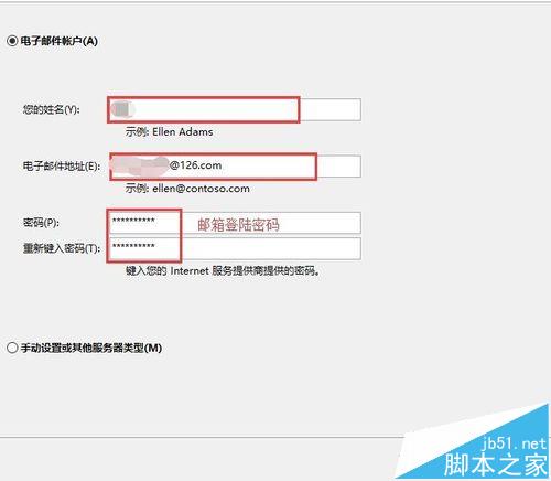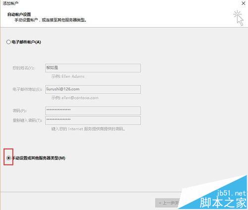 2、点选“手动设置或其他服务器类型”-“下一步”-“POP或IMAP",进入页面后填写,接受邮件服务器:pop.126.com;发送邮件服务器:smtp126.com;