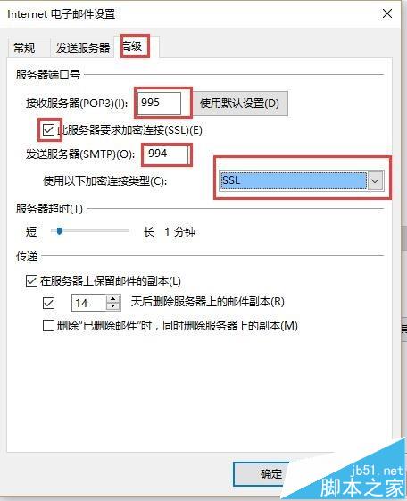 7、点选“要求安全密码验证”点击上面菜单里的“高级”。接受服务器POP3填写“995”点选“此服务需要加密连接(SSL)”,发送服务器填写“994”,选择”SSL“加密类型。点击“确定”