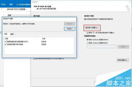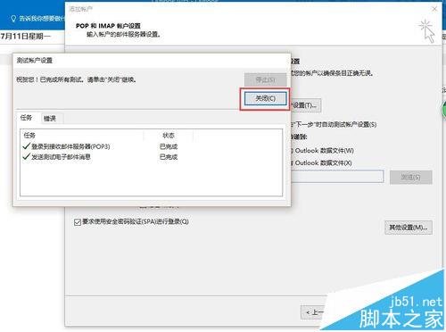 8、点击“测试账户设置”通过后“关闭”。然后点击“下一步”-“关闭”测试界面之后,“完成”设置。