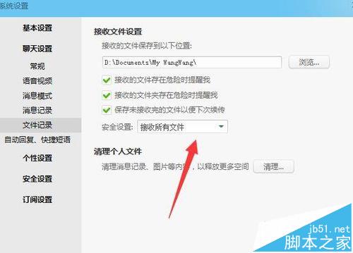 5、点击接收文件设置下面的,安全设置后面的小三角。