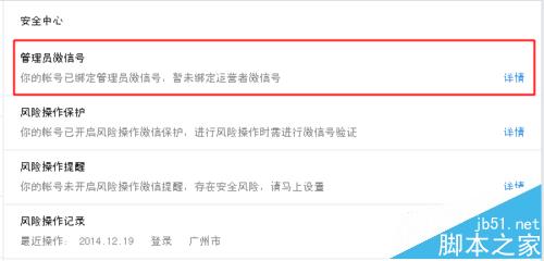 3、进入安全中心之后,在【管理员微信号】后面点击进入【详情】