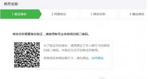 点击“修改”进入改名之后,用户需要通过账户主体微信账号扫描二维码进行验证,之后同意改名协议,设定新的名称(3-30个字符)即可。