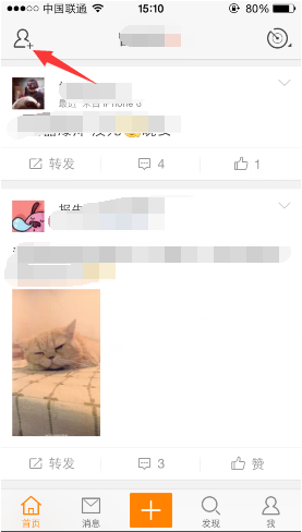 1、在新浪微博手机端首页点击左上角图标,如图: