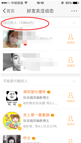 2、点击以后,我们可以直接看到周边的人,而且还有距离显示哦!大家可以点击他们的头像观看微博主页里的微博;
