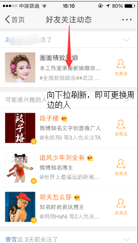 3、如果微博系统推出的周边的人你不感兴趣,可以向下拉刷新,那么就会更换周边的人哦!是不是很简单?