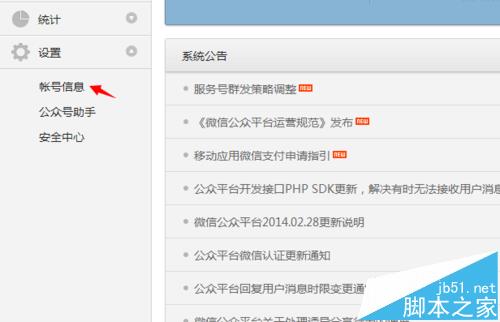2、在微信公众号界面中,点击左侧列表项中的“设置”选项设置您的帐号信息。在这个帐号信息下点击选择“帐号信息”选项,如图所示。