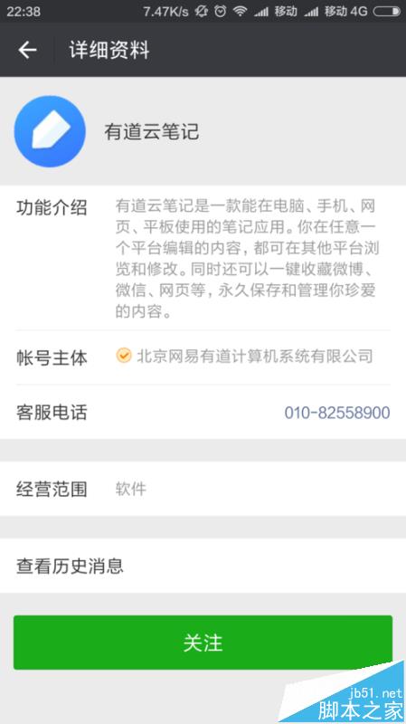 1、添加有道云笔记,点击关注。