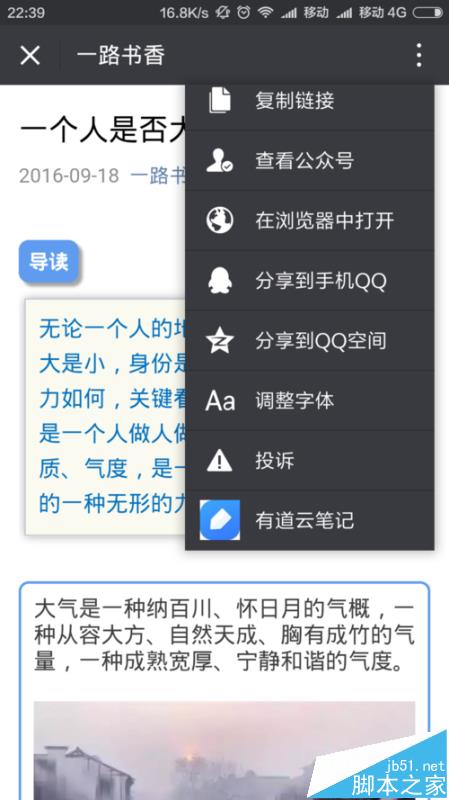 4、找到想要收藏的的微信公众号文章,点击右上角下拉,找到有道云笔记,点击有道云笔记。