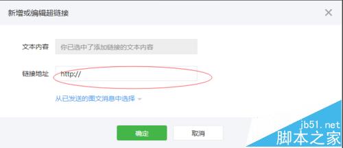 4、在素材编辑器里,选中要附上链接的文本/图片然后点击超链接按钮