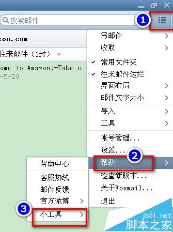 1、打开foxmail客户端,点击右上角,弹出菜单,如下图所示。