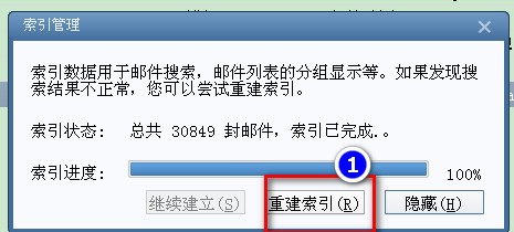 3、点击【重建索引】,如下图所示,重建索引的快慢和你的邮件数量有关。