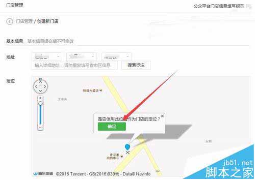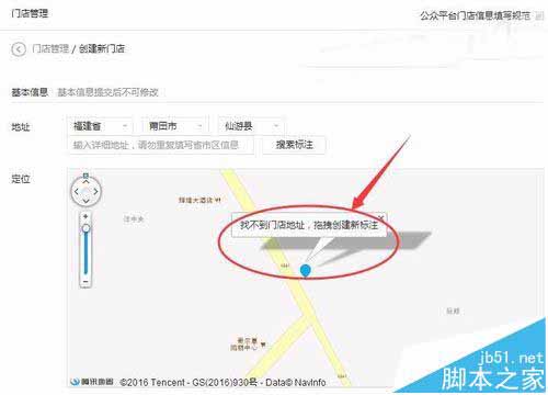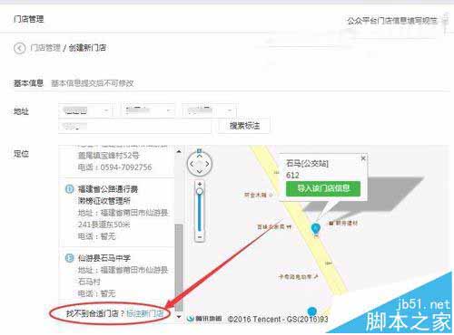 3、在 基本信息页,输入对门店位置进行查询,如果地图上没有,可标注新门户