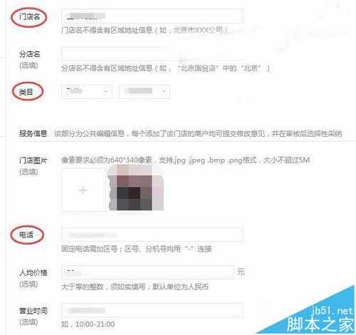 5、再输入 门店名称,所属类目,除了选填的内容,其他的全部按实际情况填写,