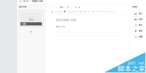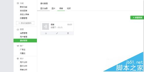 8、点击素材管理,进入图文编辑界面,然后选择语音,插入语音素材就可以将之前保存的语音添加到图文素材里了。