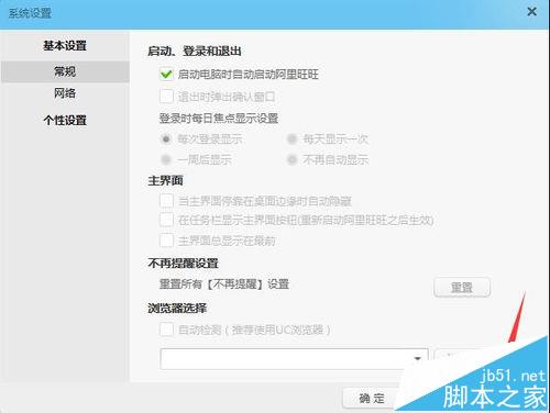 3、点击这个“常规”选项,右侧会出现一些菜单选项的内容,上方有一个“启动电脑时自动启动阿里旺旺”。