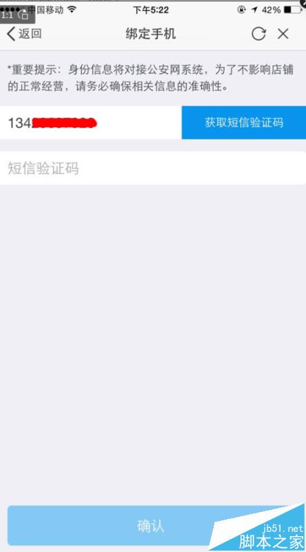 6、进入验证手机,填写认证手机号,接收验证码(在同一店铺内,该页面输入的手机号码,只能使用一次)如图: