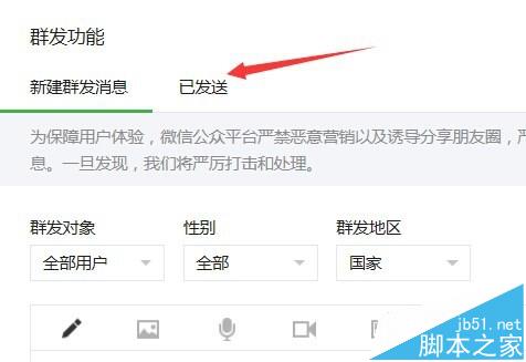2、点进去后,默认的是“新建群发消息”,在它旁边有个“已发送”,点击就能看到已发送的素材了: